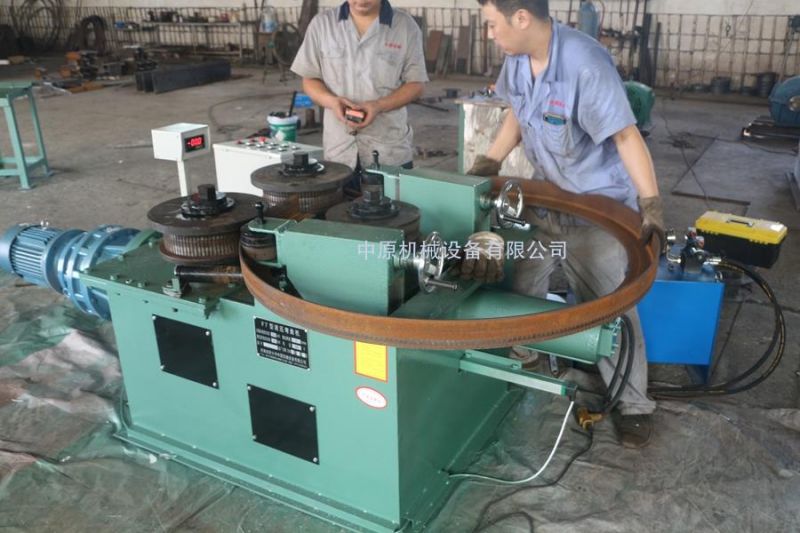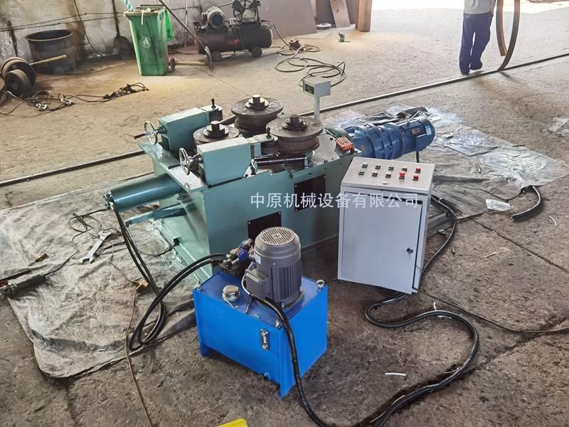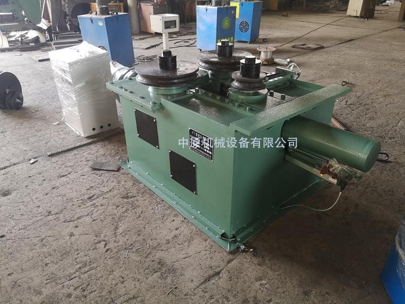 该机为叁辊型材卷圆机,集机电一体。电机输出的较高转速通过传动装置(联轴器,减速机,齿轮等)转换成所需的大扭矩低转速,带动固定位置的两主动辊实现旋转运动,为型材行走提供扭矩。被动辊通过油缸前进、后退实现位移,来控制直径大小。三个工作辊成等腰三角形分布,通过调整移动辊实现这三个点形成的弧线达到所需弯曲半径,借助被动辊的压紧及两主动辊的旋转运动,使型材经过多次连续弯曲,产生永久性塑性变形,用于常温状态下将型材卷制成圆形,弧形等工件。