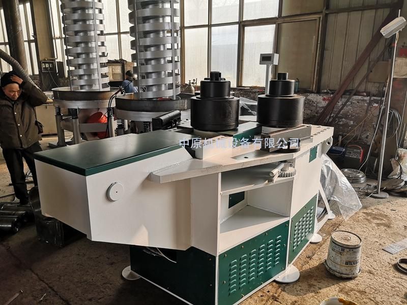 床身为一封闭式框架结构,驱动两辊位置固定,可以进行正反方向旋转,油缸推进模可前后移动,两固定模的转动为液压传动、由液压马达驱动。推进模由液压油缸的伸缩来完成。传动平稳、安全可靠;在固定模的两侧设有托辊装置,托辊既可以做升降运动,也可以做旋转运动。配合模具与导向轮同时作用有利于控制型材的卷制精度。